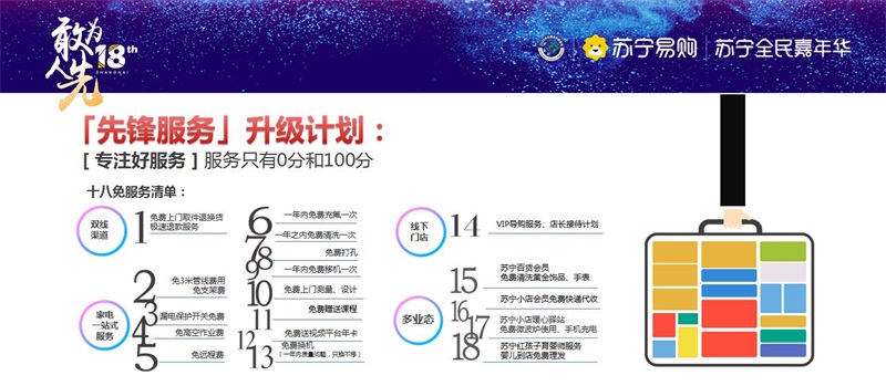 具體來看包括:針對蘇寧線上線下購買產(chǎn)品,可享免費(fèi)上門取件退換貨,極速退款服務(wù)。針對門店購物方面,將有VIP金牌導(dǎo)購服務(wù)、店長接待計(jì)劃。針對家電細(xì)分領(lǐng)域,將推出免3米管線費(fèi)用、免高空作業(yè)費(fèi)、一年之內(nèi)免費(fèi)清洗一次、免費(fèi)打孔;免費(fèi)上門測量、設(shè)計(jì)、調(diào)試;免費(fèi)換機(jī)(一年內(nèi)有任何質(zhì)量問題,只換不修)等服務(wù)。在多業(yè)態(tài)方面,蘇寧百貨會(huì)員免費(fèi)清洗黃金飾品、手表;蘇寧小店會(huì)員可享免費(fèi)快遞代收,小店暖心驛站將為前線的快遞小哥、安裝維修工等群體,提供免費(fèi)微波爐使用、手機(jī)充電等;蘇寧紅孩子免費(fèi)育嬰師服務(wù),嬰兒到店免費(fèi)理發(fā)。