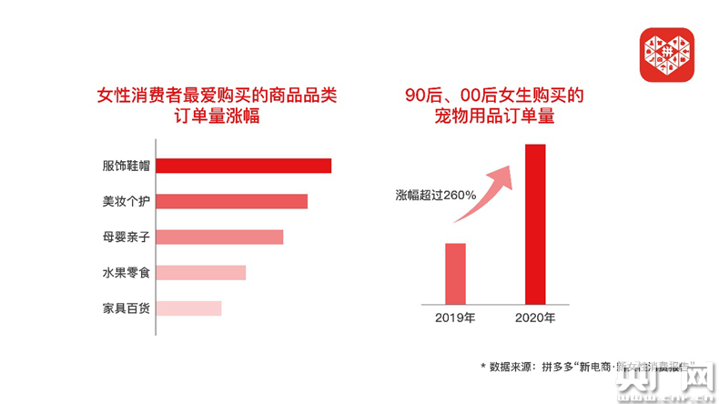 央廣網(wǎng)上海3月8日消息(記者傅聞捷)3月8日,拼多多發(fā)布“新電商·新女性消費(fèi)報(bào)告”(以下簡(jiǎn)稱(chēng)“報(bào)告”),通過(guò)平臺(tái)數(shù)據(jù)分析及問(wèn)卷調(diào)查等形式,展示了女性消費(fèi)的新趨勢(shì):90后、00后女生年訂單量占比過(guò)半,成新一代消費(fèi)者中的主力軍;“悅己”支出大幅攀升,女裝、美妝等產(chǎn)品訂單量,增幅顯著高于其他產(chǎn)品;逛國(guó)潮、買(mǎi)國(guó)貨成為女性消費(fèi)新風(fēng)尚;年輕群體習(xí)慣晚間拼單,“熬得越晚,花得越多”。
