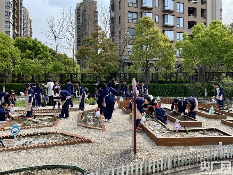 走進上海市徐匯實驗小學的校門沒幾步,就看到一群三年級的學生在一小片田地里忙得不亦樂乎。仔細觀察后可以發(fā)現(xiàn),這片小菜園被有序分成了多個區(qū)域,分別種著辣椒、茄子、香菜、黃瓜、番茄等農(nóng)作物的幼苗,學生們正在課程中充分參與翻土、施肥、澆水等多個環(huán)節(jié)。