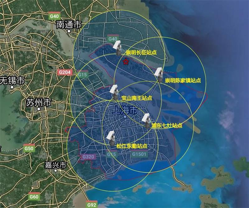 上海五部X波段相控陣陣列天氣雷達(dá)組網(wǎng)布局圖