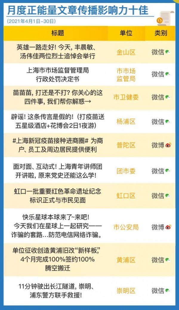 本月正能量十佳稿件中,金山區(qū)致敬消防“逆行英雄”;市市場(chǎng)監(jiān)管局教科書式“行政處罰書”獲網(wǎng)友點(diǎn)贊;市衛(wèi)健委就新冠疫苗接種問題為群眾解疑答惑,楊浦區(qū)及時(shí)澄清有關(guān)疫苗接種謠言,普陀區(qū)發(fā)布疫苗接種便民信息;團(tuán)市委、虹口區(qū)圍繞黨史學(xué)習(xí)教育開展宣傳,營(yíng)造紅色學(xué)習(xí)氛圍;市公安局借助名人效應(yīng)擴(kuò)大防范網(wǎng)絡(luò)詐騙傳播效果;黃浦區(qū)公布近期舊改情況,推動(dòng)精細(xì)化管理;崇明區(qū)刊發(fā)暖新聞,點(diǎn)贊城市正能量,均獲得網(wǎng)上較高關(guān)注。