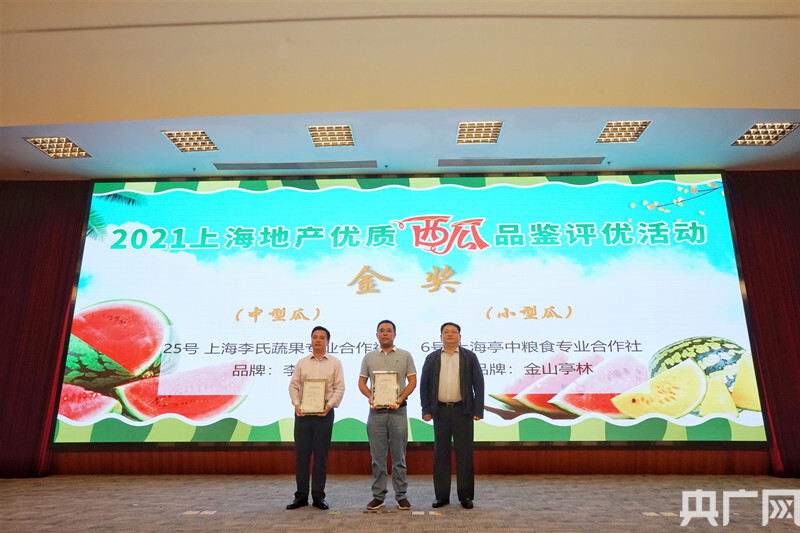 上海亭中糧食專業(yè)合作社獲得小西瓜品鑒評優(yōu)金獎。上海李氏蔬果專業(yè)合作社獲得中西瓜品鑒評優(yōu)金獎。上海市農(nóng)業(yè)農(nóng)村委員會黨組成員、副主任葉軍平為金獎獲得單位頒獎。