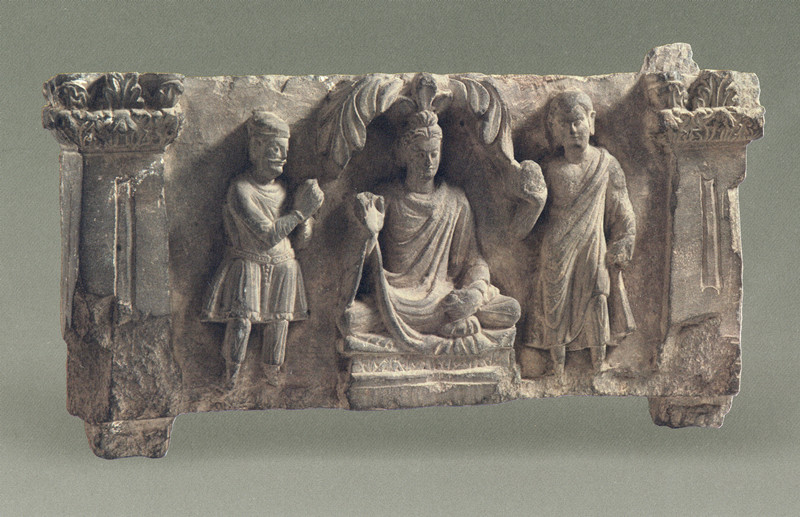 貴霜王朝時(shí)期,對(duì)于亞歷山大東征后留下的種種希臘羅馬藝術(shù),對(duì)來(lái)自西邊的伊朗高原上的瑣羅亞斯德教、東南邊印度半島的印度教和佛教,都采取了兼收并蓄的包容態(tài)度,這極大豐富了貴霜時(shí)期的藝術(shù)表達(dá)方式。展覽中的“豐收女神坐像”是希臘藝術(shù)中常用到的素材,女神衣裙紋線流暢優(yōu)美,右手上舉,左手于膝頭持握豐饒角(Cornucopia),表情慈祥。從此件雕塑中,可以看出希臘藝術(shù)在貴霜地區(qū)的深入影響。另一件展品“禮拜佛陀建筑構(gòu)件”上的浮雕描述了菩薩、供養(yǎng)人共同聆聽釋迦牟尼說(shuō)講佛法的場(chǎng)景,象征希臘建筑雕塑的科林斯柱頭與講經(jīng)說(shuō)法場(chǎng)景協(xié)調(diào)于一處。