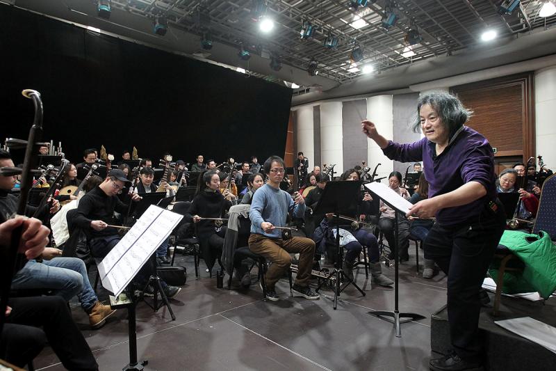 上海民族樂團(tuán)在湯沐海指揮下進(jìn)行歐洲巡演項(xiàng)目《海上生民樂》音樂會(huì)版排練。