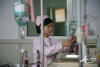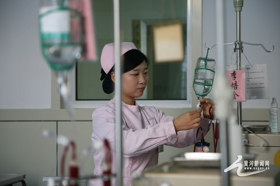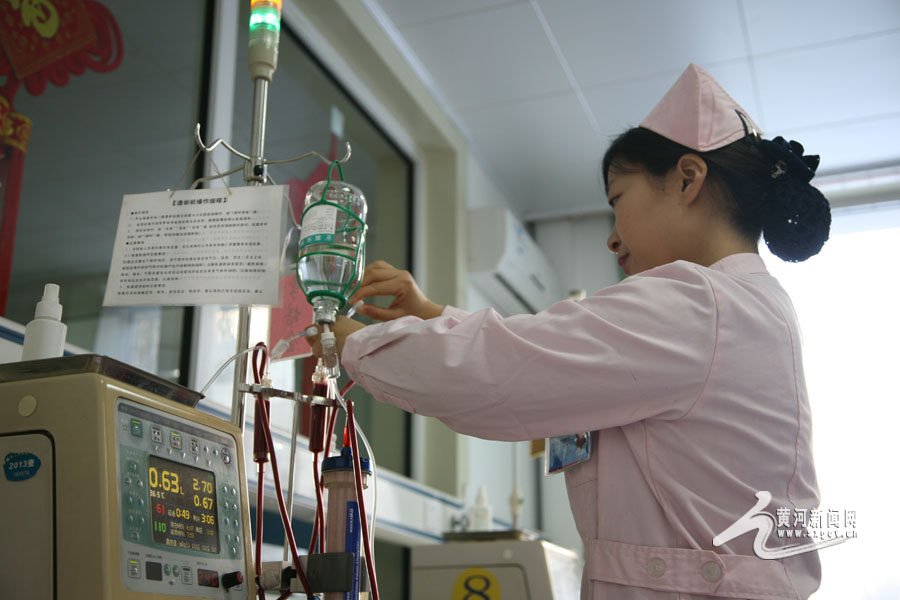 為上機(jī)患者檢查針口,與他們進(jìn)行細(xì)心的溝通交流 9點(diǎn)15分,記者跟隨護(hù)士來到一樓透析二室,病房門正對著一扇大窗戶,室內(nèi)光線充足。透析室有12張床位,賈媛媛為病人換藥時,擔(dān)心液體過快會影響病人的身體狀況,她會仔細(xì)觀察每個細(xì)節(jié),如:“注射口是否疼痛,注射針情況,病人血壓、血糖情況是否正常等”。 對于下機(jī)血糖低的患者,賈媛媛會及時給予血糖補(bǔ)充;對于下機(jī)身體腫脹不適的患者,她會親自按揉腿部,緩解患者的不適感;對于情緒不佳的患者,她會在提供專業(yè)護(hù)理的同時,更加側(cè)重于精神的鼓勵和心理開導(dǎo)。 -