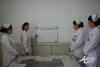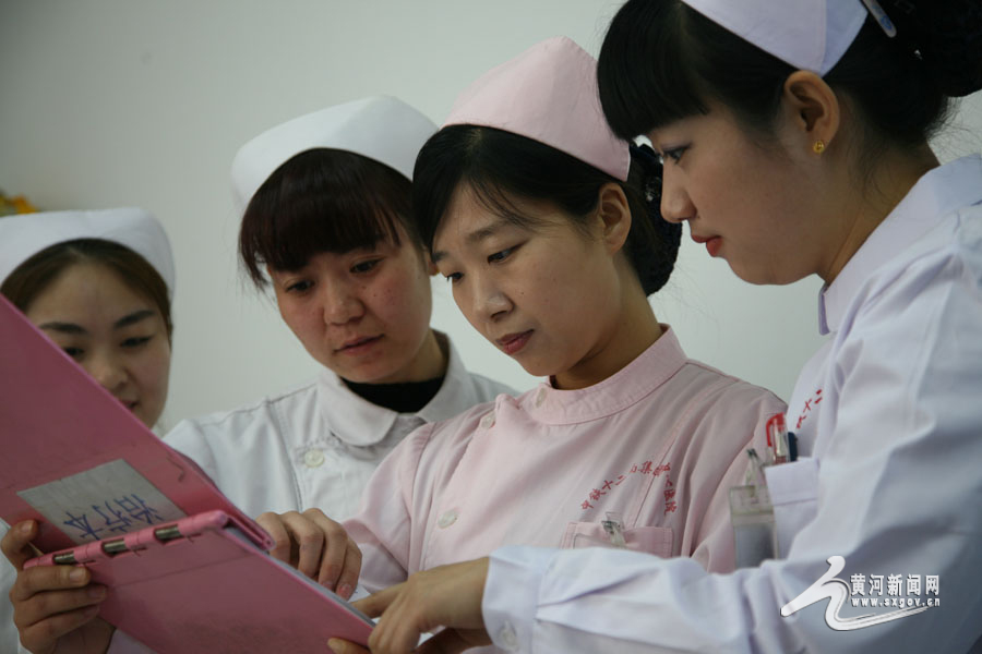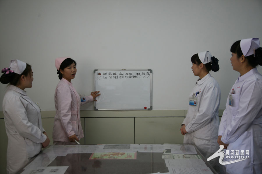 賈媛媛在辦公室為患者記錄醫(yī)囑。 10點(diǎn)12分,賈媛媛來到相關(guān)科室,與護(hù)士杜敏、林寶霞、王蓉蓉(上圖中從左到右)進(jìn)行護(hù)理會診,為一名聾啞患者研究個性化的護(hù)理治療方案。 -