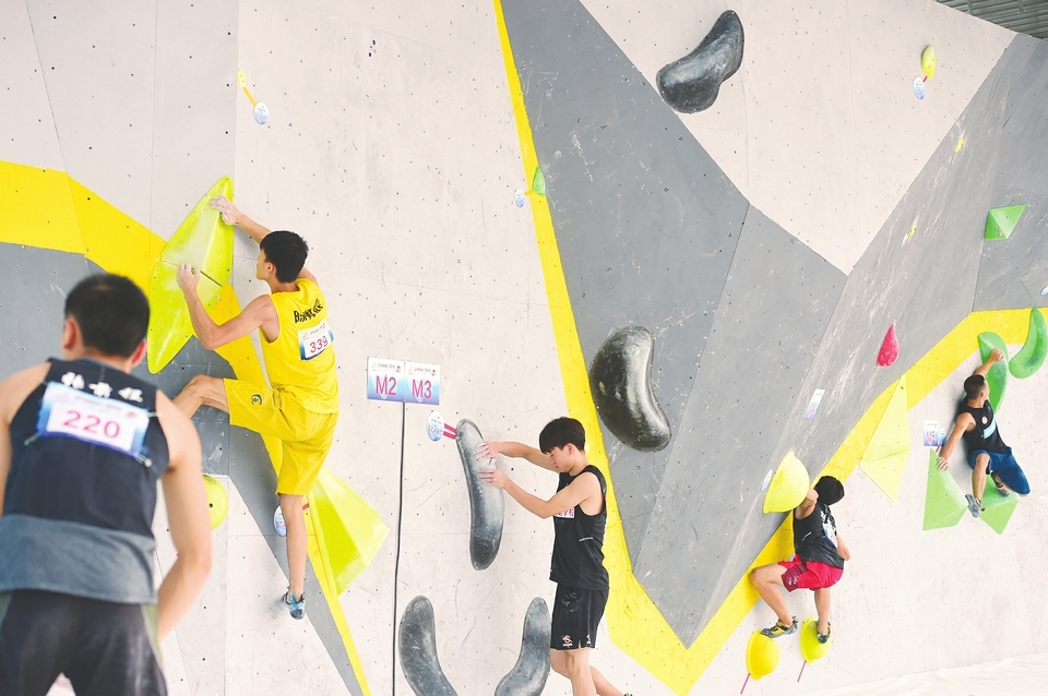 8月5日,二青會攀巖比賽預(yù)賽在太原煤炭交易中心舉行。圖為參賽選手在賽場中奮力拼搏。(記者 阮洋)