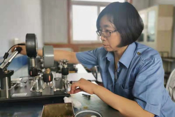 班組職工賈海霞工作經(jīng)驗豐富,每月她檢定合格的鐵路專業(yè)壓力表有近200塊。靈巧的雙手,嫻熟的動作,一套拆卸、試驗、記錄、清潔、粘貼標識、施封等操作流程,在她手里顯得格外流暢。壓力表中的游絲松動、損壞,將直接導(dǎo)致指針產(chǎn)生位移。重新整理纖細的游絲也絲毫難不倒賈海霞,她拆開表盤,一手扶穩(wěn)表身,一手拿著鑷鉗,小心翼翼地夾住游絲,一拎一壓一推一轉(zhuǎn),游絲就乖乖地在表盤里均勻地盤成圈,整個過程手絲毫不見抖動。班組剛來的職工問她盤游絲的秘訣時,她總是說:“也沒什么秘訣,就是個手感,多練練就會了!