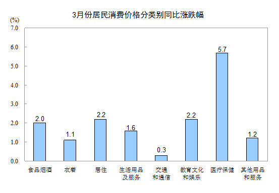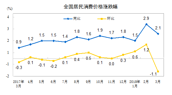 2018年3月份,全國居民消費(fèi)價(jià)格同比上漲2.1%。其中,城市上漲2.1%,農(nóng)村上漲1.9%;食品價(jià)格上漲2.1%,非食品價(jià)格上漲2.1%;消費(fèi)品價(jià)格上漲1.6%,服務(wù)價(jià)格上漲2.8%。一季度,全國居民消費(fèi)價(jià)格總水平比去年同期上漲2.1%。