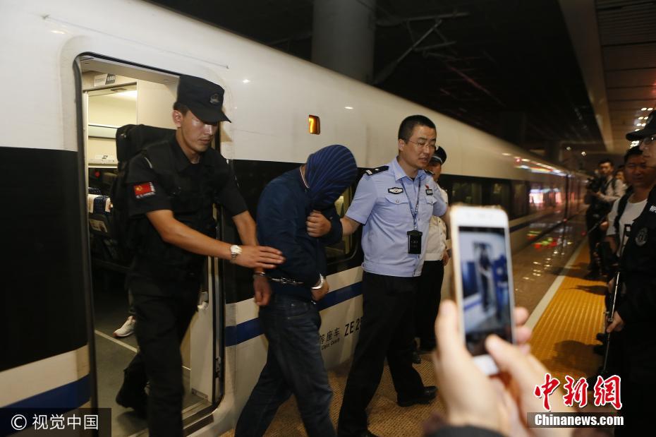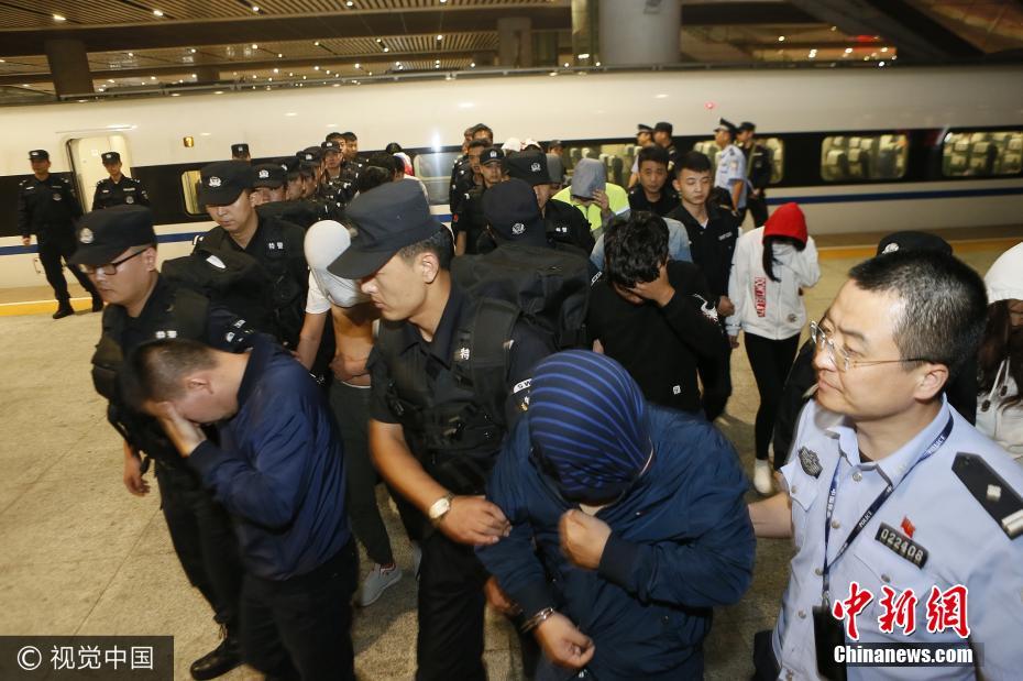9月4日晚11時許,隨著列車緩緩進(jìn)站,25名犯罪嫌疑人從哈爾濱押解回西安。據(jù)該局相關(guān)負(fù)責(zé)人介紹,押解時間長達(dá)一天一夜,為防止嫌疑人自殘或脫逃,押解民警將自己和嫌疑人拷在一起。目前,這25名嫌疑人因涉嫌網(wǎng)絡(luò)詐騙,已被公安航天分局立案調(diào)查,目前案件還在偵辦中。張杰攝 圖片來源:視覺中國