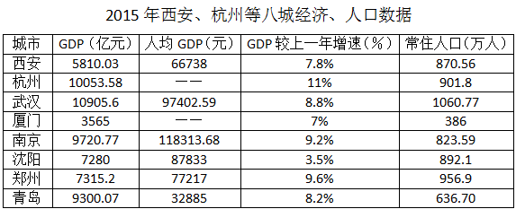 另11城中,天津、成都、重慶就綜合實力而言成為國家中心城市極有可能。沈陽、南京、武漢、西安、杭州、青島、鄭州、廈門中,以2015年為例,西安在經(jīng)濟指標、人口數(shù)量排名靠后,雖無明顯優(yōu)勢,但仍具競爭力。