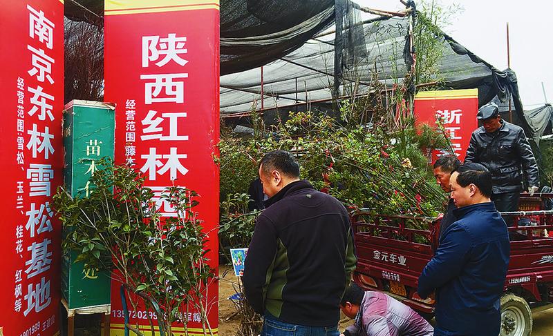 圖為客商在周至啞柏苗木花卉交易大廳大苗交易區(qū)選購(gòu)苗木。