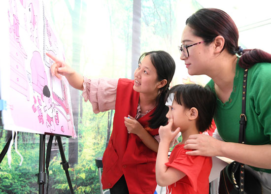 復(fù)旦大學(xué)附屬兒科醫(yī)院門診大廳內(nèi),志愿者在為患兒做意外傷害預(yù)防宣導(dǎo)。孫國根/攝