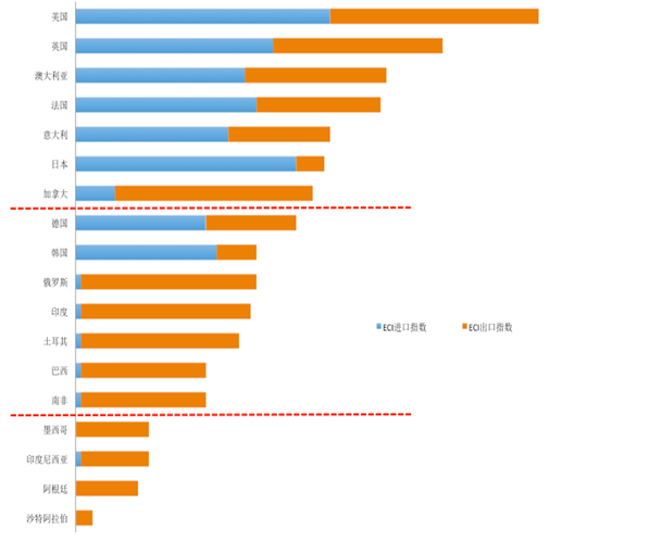 根據(jù)阿里巴巴跨境電子商務(wù)大數(shù)據(jù)(涉及B2B出口、B2C出口和B2C進(jìn)口)編制的ECI指數(shù)(E-Commerce Connectivity Index between China and Major Economies, 中國(guó)與主要經(jīng)濟(jì)體跨境電商連接指數(shù))來(lái)看,在二十國(guó)集團(tuán)(G20)國(guó)家中,2015年中國(guó)與G20其他國(guó)家的跨境電商連接指數(shù)排名是:美國(guó)、英國(guó)、澳大利亞、法國(guó)、意大利、日本、加拿大、德國(guó)、韓國(guó)、俄羅斯、印度、土耳其、巴西、南非、墨西哥、印度尼西亞、阿根廷、沙特阿拉伯(暫不包括歐盟)。