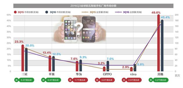 在今年三季度,OPPO 和 vivo兩家公司首度成為中國市場的手機品牌出貨冠亞軍,出貨量同比2015年增長106%和101%,市場占有率分別為17.5%和16.7%。華為、小米、蘋果分列第3到第5名。