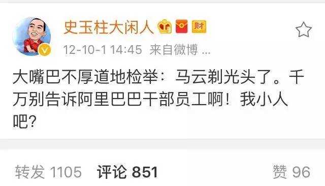 但是有一個人,和他的關(guān)系并非一般的好。這個人是史玉柱,據(jù)說2012年馬云剃光頭是受了史玉柱的影響,當(dāng)時,史玉柱還在 調(diào)侃了一下馬云。