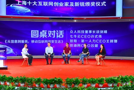圓桌對(duì)話環(huán)節(jié),人民網(wǎng)上海分公司總經(jīng)理金煜純攜手眾人科技董事長(zhǎng)談劍峰、七牛云CEO許式偉、智陽(yáng).第一人力CEO王穎娜、找油網(wǎng)CEO呂健等嘉賓就“從信息到服務(wù),移動(dòng)互聯(lián)網(wǎng)改變生活”主題進(jìn)行了探討。