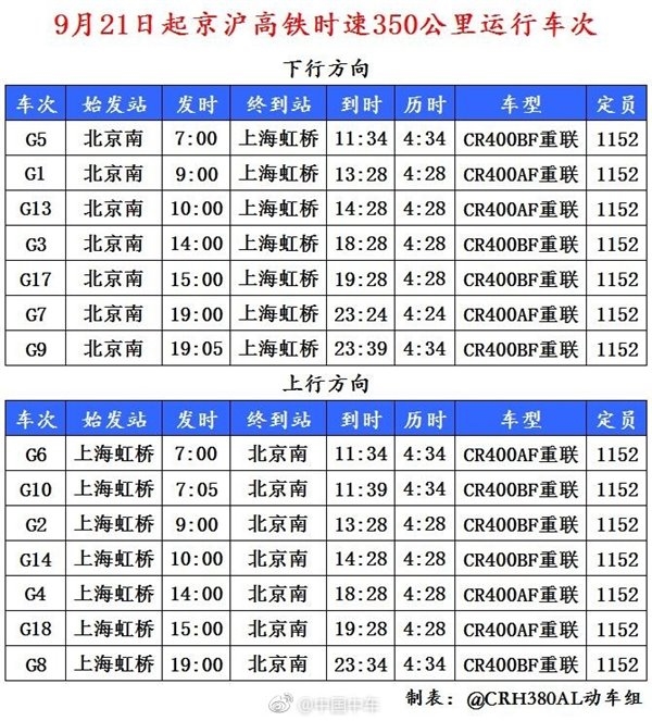 現(xiàn)在,中國鐵路再次發(fā)出公告稱,從9月21日起,他們將安排7對“復(fù)興號”動(dòng)車組在京滬高鐵按時(shí)速350公里運(yùn)行,與此同時(shí)還送出了這些列車的詳細(xì)車次、列車時(shí)刻表。
