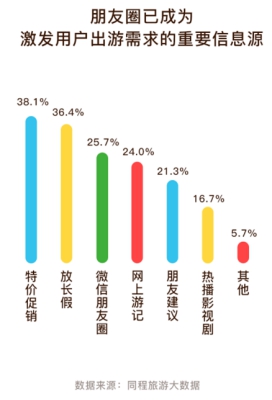 事實(shí)上,微信平臺不僅在用戶出游前的資訊獲取和出游過程的動態(tài)分享中扮演重要角色,而且對用戶的旅游購買決策也擁有較大的影響力!秷蟾妗分衼碜酝搪糜未髷(shù)據(jù)的研究顯示,“特價促銷”、“放長假”和好友的朋友圈分享是影響人們旅游購買決策的三大因素。有相當(dāng)一部分微信用戶在看到好友朋友圈分享的出游動態(tài)后萌生出游的想法,或者通過好友群等渠道獲取出游建議等信息。