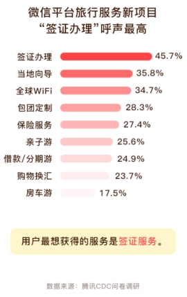 《報告》數(shù)據(jù)顯示,除了標(biāo)準(zhǔn)化程度較高的交通票務(wù)、住宿等旅行產(chǎn)品外,用戶還希望微信平臺(錢包)能夠新增簽證辦理、當(dāng)?shù)叵驅(qū)、全球WiFi、包團(tuán)定制、保險、親子游、分期游、購物換匯、房車游等旅行服務(wù)(產(chǎn)品)。這表明,微信用戶希望在微信平臺上獲得更加豐富的旅行服務(wù)(產(chǎn)品)。