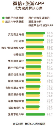 《報告》中有關(guān)微信平臺和旅游APP兩個購買渠道的使用滿意度調(diào)查數(shù)據(jù)顯示,微信平臺在支付安全方便、平臺可靠性等方面相對旅游APP具有優(yōu)勢,而旅游APP則在購買流程便捷性、價格、旅游信息詳細(xì)程度等方面具有優(yōu)勢。其中,微信平臺提供的旅行相關(guān)服務(wù)無需下載APP的“輕應(yīng)用”優(yōu)勢得到了受訪者的認(rèn)可。