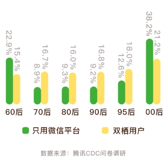 鑒于微信平臺和旅游APP作為旅游產(chǎn)品購買渠道各有優(yōu)劣,有相當(dāng)一部分用戶選擇了兩個平臺都使用的策略!秷蟾妗窋(shù)據(jù)顯示,16.7%的受訪用戶屬于“雙棲用戶”,即微信平臺和旅游APP都使用過。交叉分析顯示,微信平臺用戶中有56.8%同時會使用旅游APP,旅游APP用戶中有19%會同時使用微信平臺。從用戶年齡層來看,“00后”群體只用微信平臺的比例相對最高,達(dá)到了38.2%。