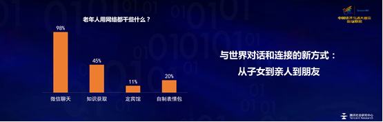 作為國(guó)內(nèi)領(lǐng)先的互聯(lián)網(wǎng)增值服務(wù)商,騰訊依托豐富的社交大數(shù)據(jù)積累,與央視聯(lián)合發(fā)布《互聯(lián)網(wǎng)與中老年人的社交和社會(huì)參與》大數(shù)據(jù)報(bào)告。報(bào)告指出,互聯(lián)網(wǎng)社交正在向縱深發(fā)展,老年人逐漸成為微信增長(zhǎng)主力,2017年微信數(shù)據(jù)報(bào)告顯示,55歲以上老年用戶達(dá)到5500萬(wàn),互聯(lián)網(wǎng)已經(jīng)成為老年人與世界對(duì)話和連接的新方式。