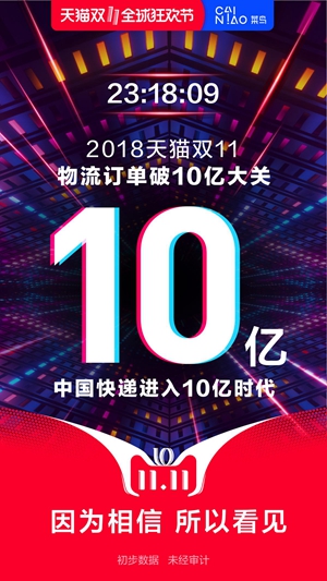 11月11日23點18分09秒,2018天貓雙11當(dāng)日物流訂單量突破10億大關(guān),十年來強勁增長3800多倍。這是一個歷史性的跨越,宣告中國快遞進入一天10億的新時代,顯現(xiàn)出中國商業(yè)的巨大活力和強勁消費信心。