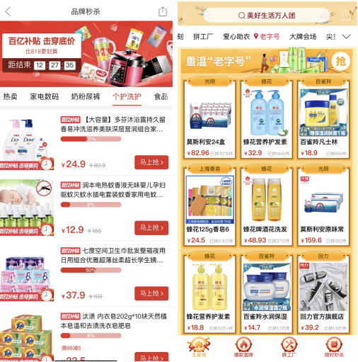 活動數(shù)據(jù)顯示,家電數(shù)碼、日化、母嬰類產(chǎn)品擁有最高的達成率:190元的美的電壓力鍋、89元的蘇泊爾煎餅機、54.9元的九陽榨汁機、259.9元的格蘭仕微波爐等家電系列標品,成為截至目前的明星產(chǎn)品。汰漬、多芬、七度空間等個護洗護類高頻消費品,在平均成團時長上占據(jù)明顯優(yōu)勢;“上海老字號品牌特惠專場“則在整體成交轉化率上維持領先。