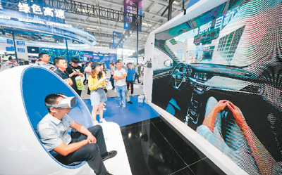 2019中國(guó)國(guó)際智能產(chǎn)業(yè)博覽會(huì)上,在東贏恒康控股集團(tuán)展臺(tái),一名參觀者通過(guò)VR體驗(yàn)無(wú)人駕駛汽車自動(dòng)入庫(kù)停車。