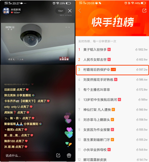從開(kāi)播到收官,《國(guó)家監(jiān)察》的直播間觀看總?cè)舜纬掷m(xù)增長(zhǎng),相關(guān)話題多次登上快手站內(nèi)熱榜。1月12日,首播第一集《擘畫(huà)藍(lán)圖》便登上站內(nèi)熱榜第四位,直播間觀看總?cè)舜纬?60萬(wàn),到14日,第四集《護(hù)航民生》的直播間觀看總?cè)舜我堰_(dá)480萬(wàn),播放到第五集時(shí),圍觀用戶已經(jīng)超過(guò)了500萬(wàn)人次。