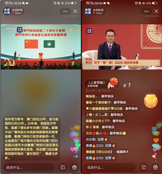 在澳門(mén)回歸祖國(guó)20周年之際,快手聯(lián)合央視新聞進(jìn)行了6場(chǎng)系列直播,累計(jì)觀看人次超過(guò)4000萬(wàn);跨年夜,央視新聞推出“有你真好”特別節(jié)目,在快手號(hào)全程同步直播,直播答題互動(dòng)形式也首次出現(xiàn)在央視跨年特別節(jié)目中,累計(jì)觀看人數(shù)1.4億。