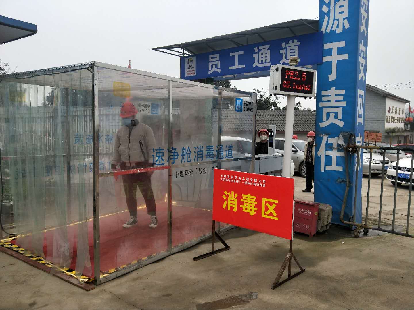 成都大邑縣污水處理廠提標(biāo)-擴(kuò)能項(xiàng)目門口,工人進(jìn)入工地需走過“速凈艙”消毒通道消毒。(項(xiàng)目工地供圖 央廣網(wǎng)發(fā))