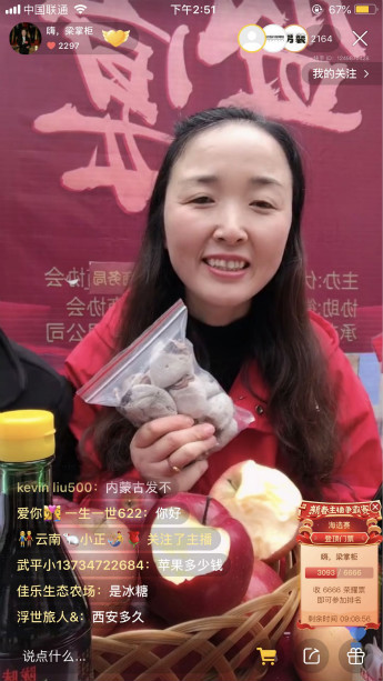 商業(yè)嗅覺敏銳的梁倩娟緊跟時代步伐,發(fā)現了短視頻和直播的潛力。2019年,她在快手發(fā)布了第一條短視頻,記錄她去北京參加兩會的見聞。之后,她便經常在快手錄短視頻和直播,展示家鄉(xiāng)的蘋果、核桃、蜂蜜等土特產。2019年,梁倩娟在快手賣的農產品超過了10萬斤。