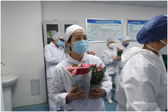 3月7日下午,金銀潭醫(yī)院上海醫(yī)療隊(duì)1500名女醫(yī)護(hù)人員,正在挑選心愛的鮮花。