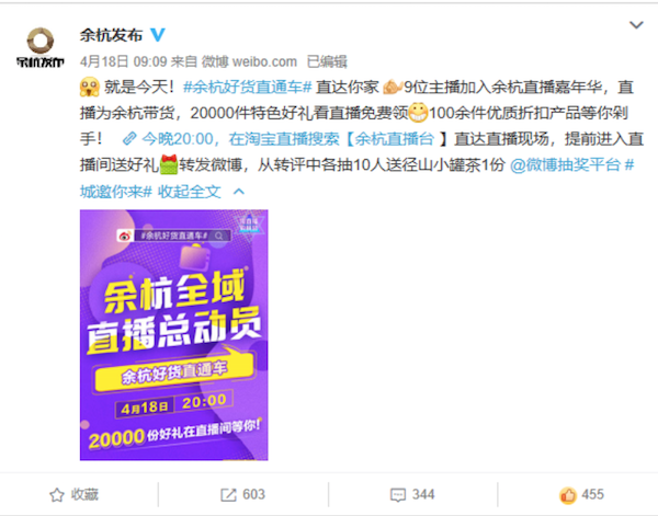 4月18日, @余杭發(fā)布 正式發(fā)布預告,表示將于18日晚20:00,在淘寶直播為余杭帶貨。
