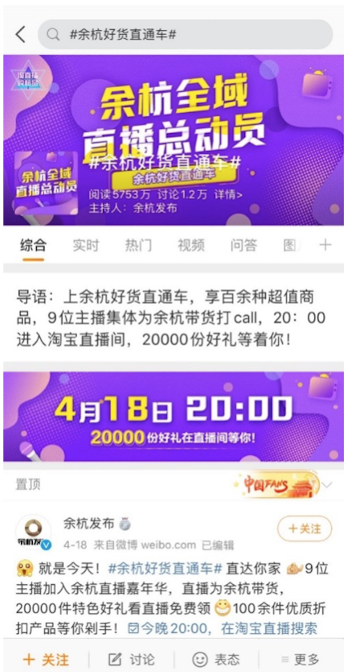 本次#余杭好貨直通車#的宣推充分認識到了流量的重要作用。在直播前,@余杭發(fā)布 充分利用微博的巨大聲量進行傳播推廣,再導流到淘寶進行進一步的經(jīng)濟轉(zhuǎn)化。作為一個綜合平臺,微博在這個過程中能夠為品牌提供直播前、直播中、直播后期的全流程話題營銷。在微博進行前期宣推,到淘寶進行直播售賣,最后再回到微博進行效果傳播、品牌印象加固,形成了一次直播帶貨活動的完美閉環(huán)。
