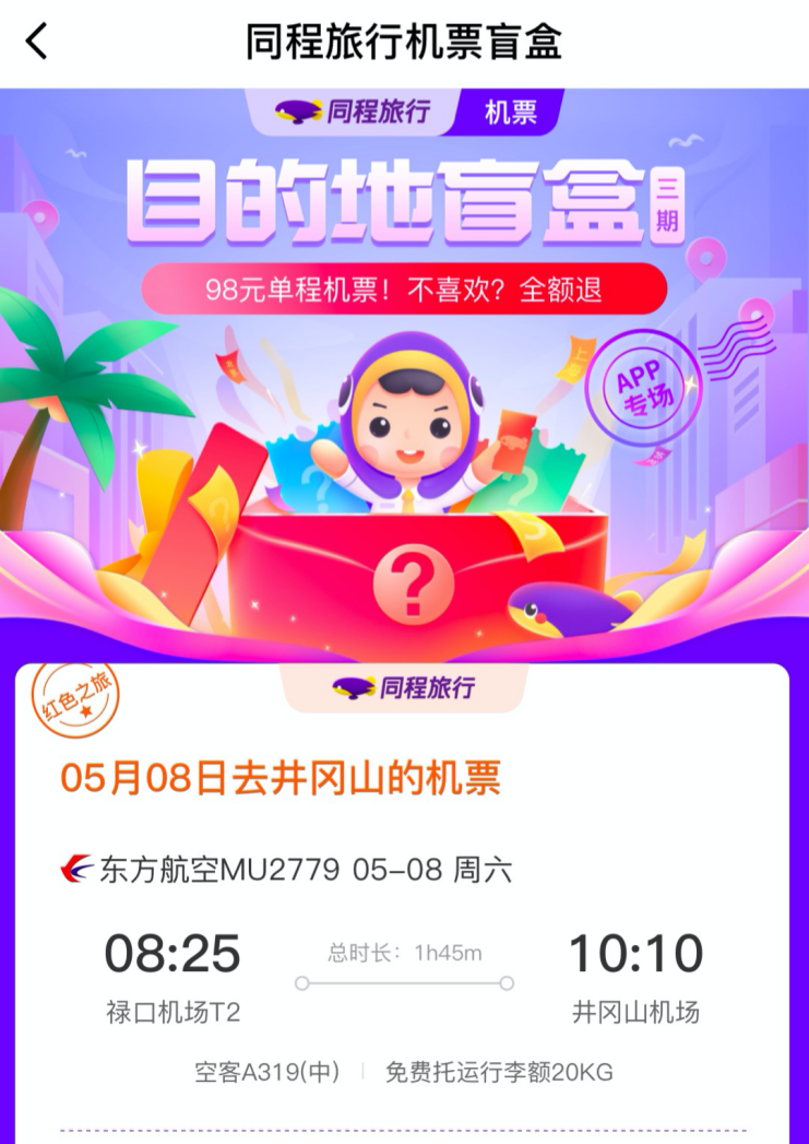 據(jù)了解,同程旅行機(jī)票盲盒第三期活動,仍延續(xù)了此前用戶喜愛的玩法。用戶只需要花費98元(含稅),就可以開啟一張指定出發(fā)地,隨機(jī)目的地、隨機(jī)出發(fā)時間的國內(nèi)機(jī)票,如果開出不滿意的機(jī)票還可以全額退款。相比其他模仿跟進(jìn)的盲盒活動,同程旅行的盲盒活動玩法更簡單,無需邀請好友助力,同程機(jī)票盲盒活動囊括國內(nèi)200多個出發(fā)地及200多個目的地機(jī)場,出行時間包含了當(dāng)下最熱門的“五一”小長假,還加入了用戶呼聲最高的雙人機(jī)票、往返機(jī)票、公務(wù)艙等“隱藏款”;顒悠陂g每天10:00、14:00、20:00開放機(jī)票盲盒搶購,無論此前是否購買過機(jī)票盲盒,每位用戶在本期返場活動中都有1次購買機(jī)會。