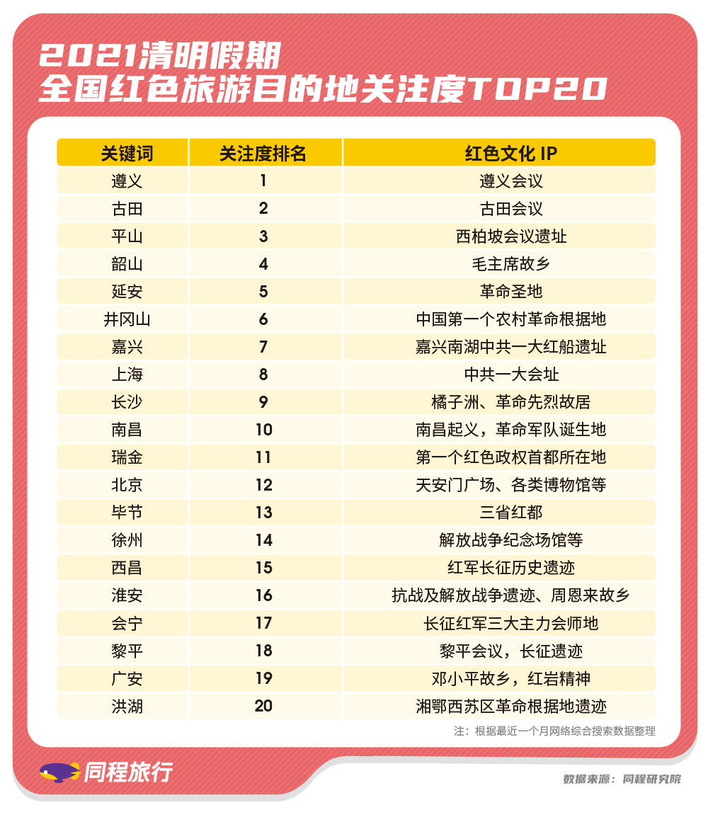 同程旅行發(fā)布的《2021清明及“五一”假期紅色旅游報告》顯示,今年春季以來全國主要紅色旅游目的地(擁有重要紅色文化IP的目的地)網(wǎng)絡(luò)關(guān)注度持續(xù)上升。其中,遵義、古田、平山、韶山、延安等與中國共產(chǎn)黨發(fā)展歷史、抗戰(zhàn)歷史及解放戰(zhàn)爭等密切相關(guān)的紅色旅游目的地更受關(guān)注。