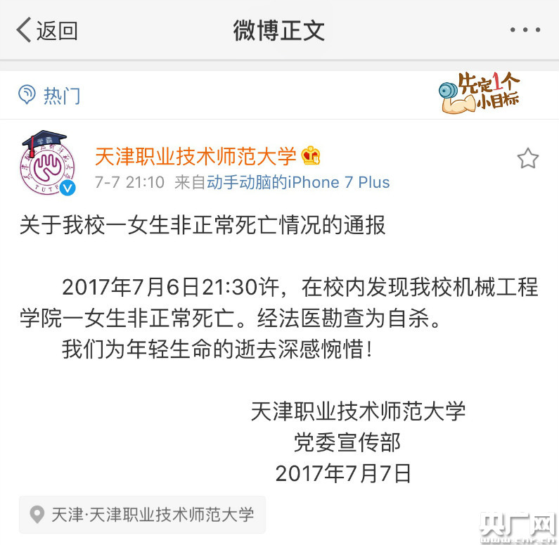 7月7日晚,校方發(fā)布情況通報(bào):“2017年7月6日21:30許,在校內(nèi)發(fā)現(xiàn)我校機(jī)械工程學(xué)院一女生非正常死亡。經(jīng)法醫(yī)勘查為自殺”。