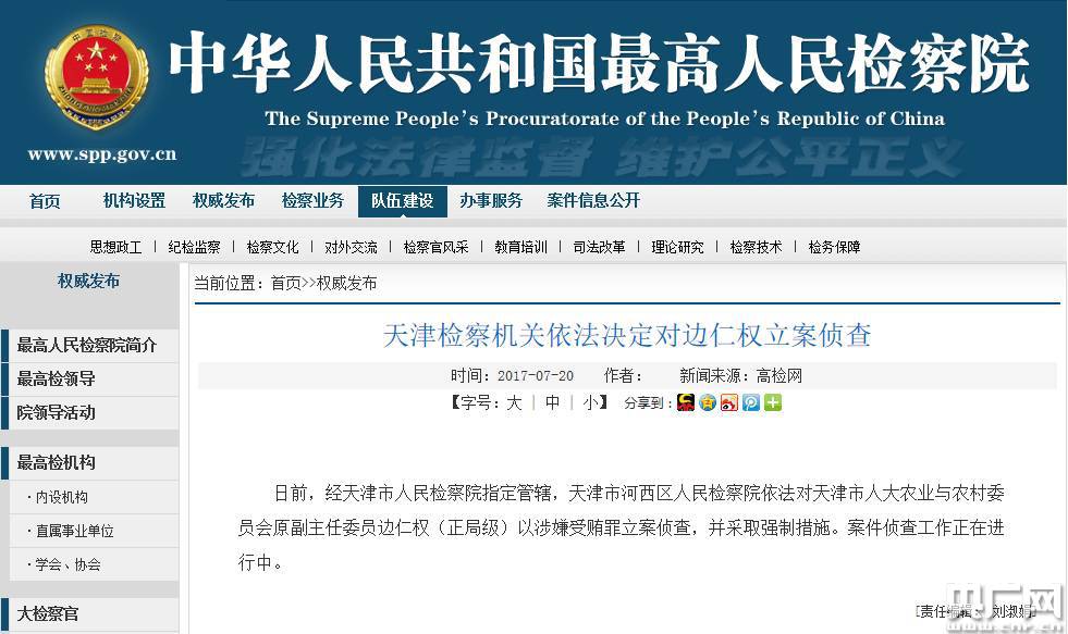 日前,經(jīng)天津市人民檢察院指定管轄,天津市河西區(qū)人民檢察院依法對(duì)天津市人大農(nóng)業(yè)與農(nóng)村委員會(huì)原副主任委員邊仁權(quán)(正局級(jí))以涉嫌受賄罪立案?jìng)刹,并采取?qiáng)制措施。案件偵查工作正在進(jìn)行中。