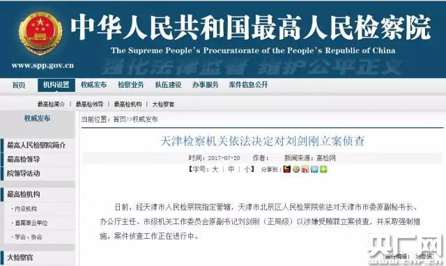 日前,經(jīng)天津市人民檢察院指定管轄,天津市北辰區(qū)人民檢察院依法對(duì)天津市市委原副秘書(shū)長(zhǎng)、辦公廳主任、市級(jí)機(jī)關(guān)工作委員會(huì)原副書(shū)記劉劍剛(正局級(jí))以涉嫌受賄罪立案?jìng)刹,并采取?qiáng)制措施。案件偵查工作正在進(jìn)行中。
