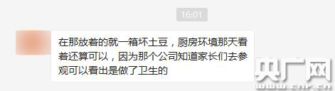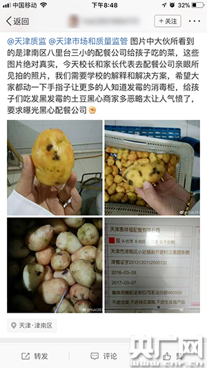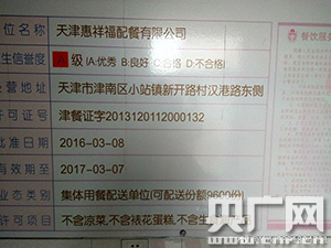 家長質(zhì)疑:配餐公司給孩子吃“黑土豆”日),她在家長微信群里了解到,津南區(qū)八里臺三小組織帶領(lǐng)學生家長代表到其配餐公司——天津惠祥福配餐有限公司進行參觀。在現(xiàn)場,家長們看到有一筐土豆發(fā)黑發(fā)霉,消毒柜也非常臟,而且公示在墻上的食品經(jīng)營許可證已過期。