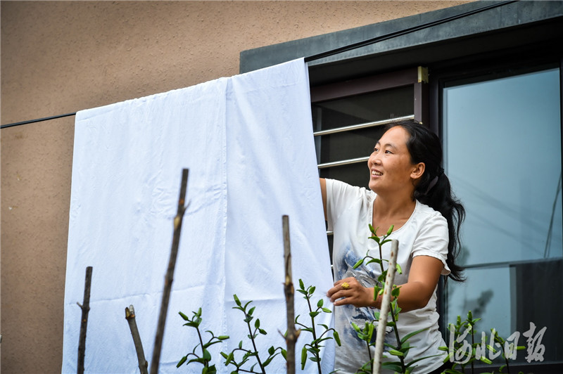 2020年7月10日,劉海林在自家的農(nóng)家院里晾曬床單,準(zhǔn)備迎接周末的客人。河北日?qǐng)?bào)記者 趙海江 攝