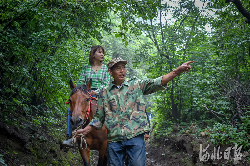 2020年7月10日,村民張小五一邊為游客牽馬,一邊講解十八盤(pán)村的由來(lái)。河北日?qǐng)?bào)記者 趙海江 攝