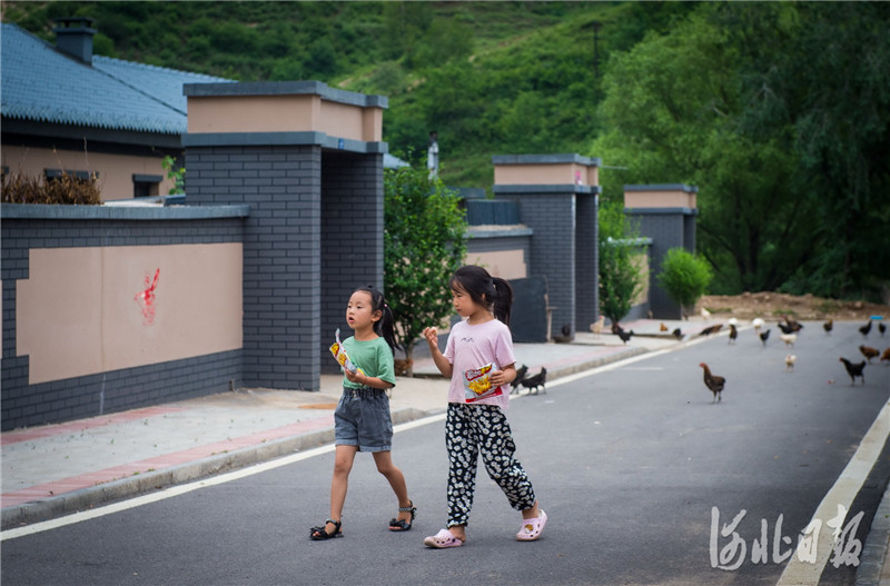 2020年7月10日,兩位小姑娘走過(guò)村中道路,漂亮的民居和潔凈的街道讓十八盤(pán)村煥然一新。