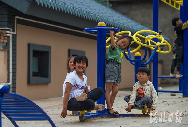 2020年7月10日,孩子們村中街邊的健身器材上玩耍。河北日?qǐng)?bào)記者 趙杰 攝