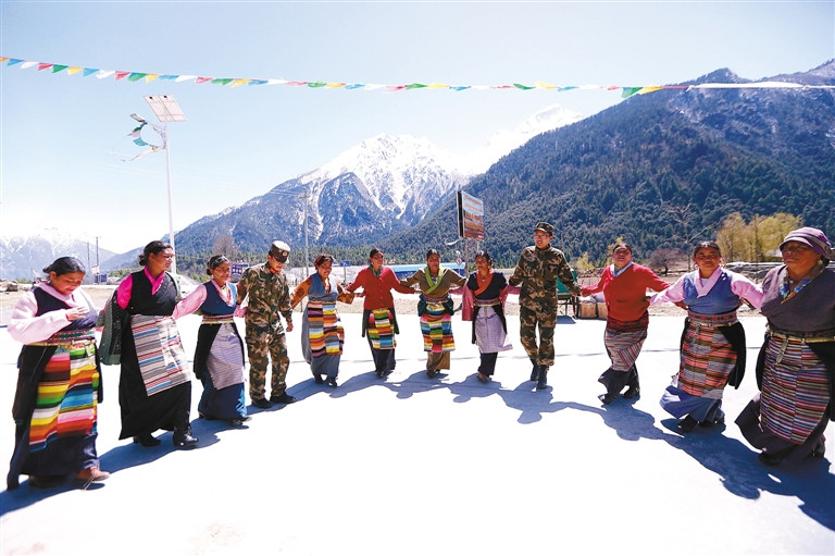武警西藏公安邊防總隊吉隆邊防檢查站官兵與駐地村民,跳起感黨恩的舞蹈《鈴響瑪》,紀念西藏百萬農(nóng)奴解放58周年。中國西藏新聞網(wǎng)通訊員 胡俊浩 記者 次旺 攝