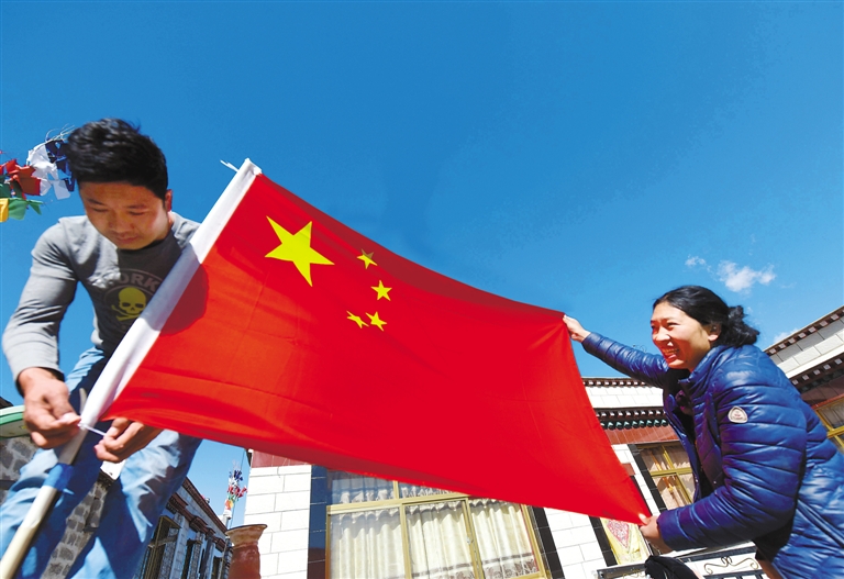 拉薩市城關區(qū)俄杰塘社區(qū)居委會居民玉珍(右)和玉杰在自家房頂上升起國旗,表達對黨的熱愛之情。中國西藏新聞網(wǎng)通訊員 胡俊浩 記者 次旺 唐斌 攝