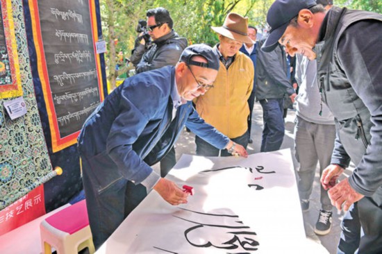 國慶期間,拉薩市宗角祿康公園、羅布林卡公園、南山公園、曲米路濕地公園舉行了文藝演出、特色產(chǎn)品展銷、書法展示、藏戲表演等一系列活動。圖為拉薩市書法家和書法愛好者在羅布林卡內(nèi)為過往市民獻上書法作品。記者唐斌 次旺 攝